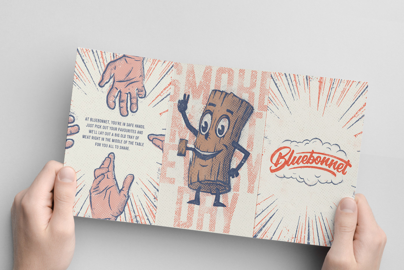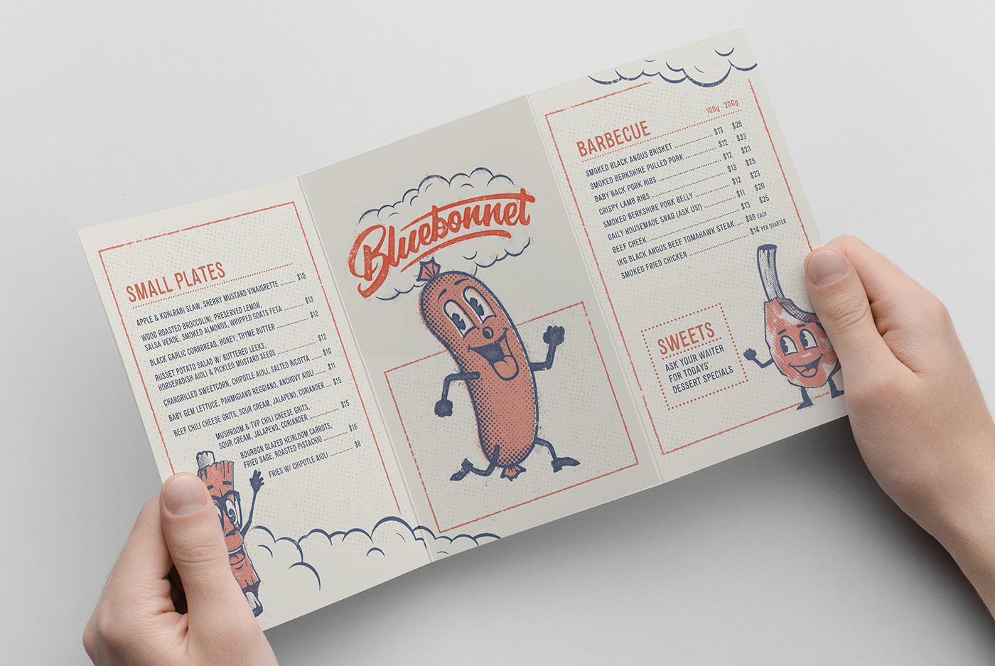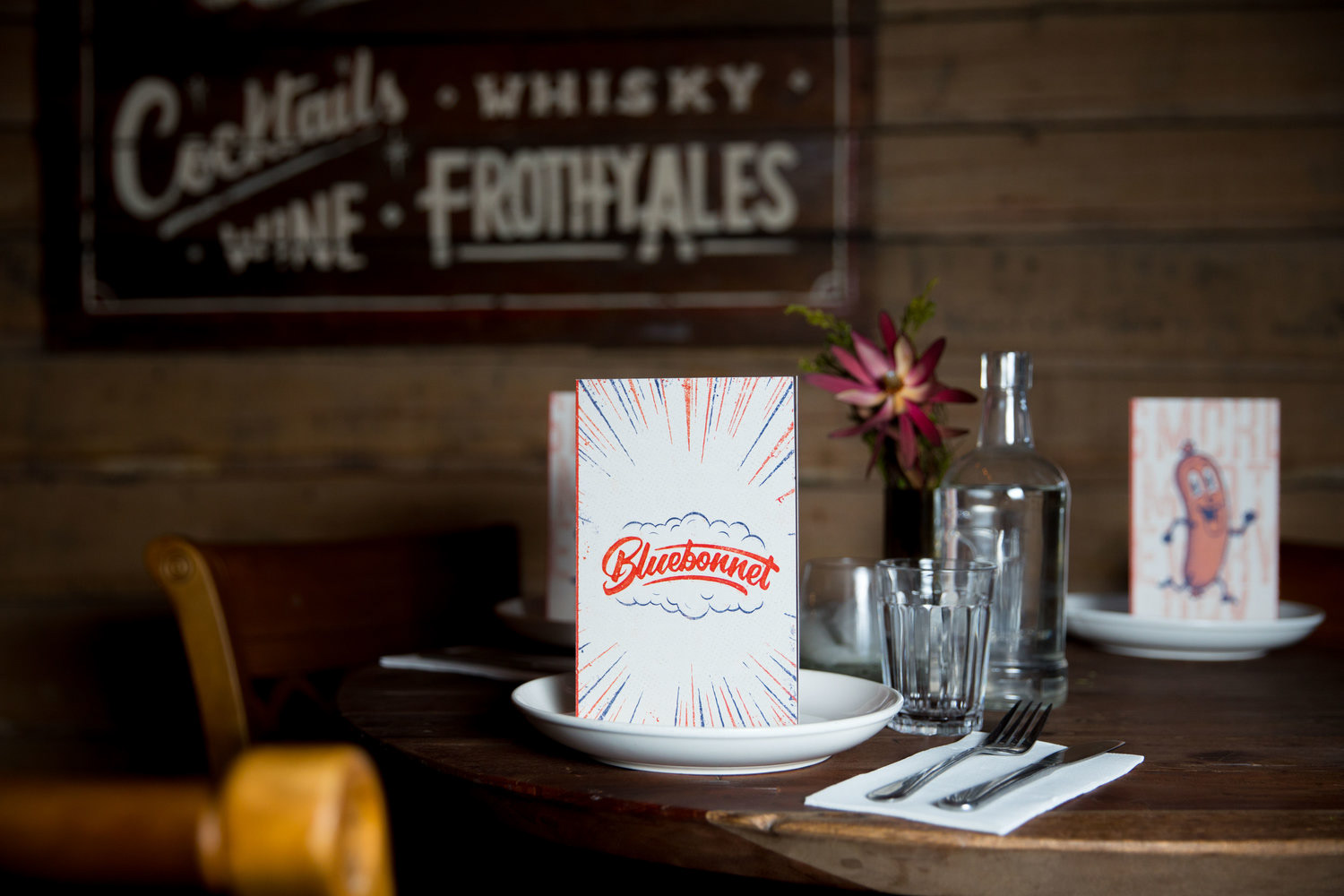 Over the last five years, Bluebonnet has proved itself in Melbourne’s thriving food scene. With the growing popularity of their American style barbecue food, they needed to find a new home and decided to step it up a notch with a new bigger venue. Taking the plunge, the team transformed a rundown old building in East Brunswick’s busy dining strip. The result is a rustic yet contemporary new space that oozes sophistication with capacity for 170 people. Inspired by this new space, the branding was created as a nod to old-school Americana. The red and blue colour palette sets the tone, the heavy use of distressing and halftone dots drives home the feeling of years gone by. The hand-drawn characters are inspired by vintage advertising and bring a real sense of fun to the brand. From business cards, menus, light-boxes and t-shirts to hand-painted signs and posters, everything was created to match the brand's raw, old school look & feel. Photos: Kate Shanasy